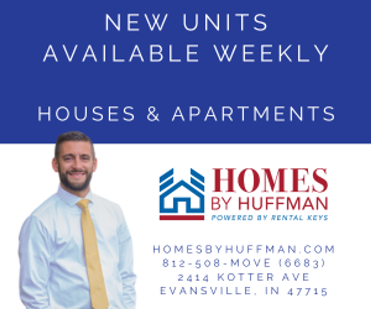 If you have any questions, please call our office at 812-508-MOVE (6683) or visit us at 2414 Kotter Ave., Evansville, Indiana 47715. Our homes generally rent quickly. Please check our websites for the current available listings HomesbyHuffman.com